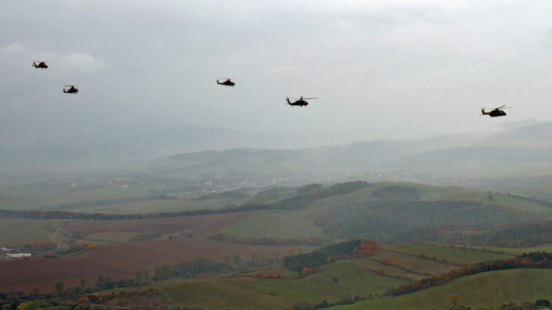 Formace slovenských, španělských a českých vrtulníků při letu nad kopcovitou krajinou v okolí prešovského letiště. V průběhu středeční letové mise panovaly na východě Slovenska typické podzimní povětrnostní podmínky, které od vrtulníkových posádek vyžadovaly absolutní soustředění při létání v kopcovitém a členitém terénu. (foto: 51. krídlo Prešov)