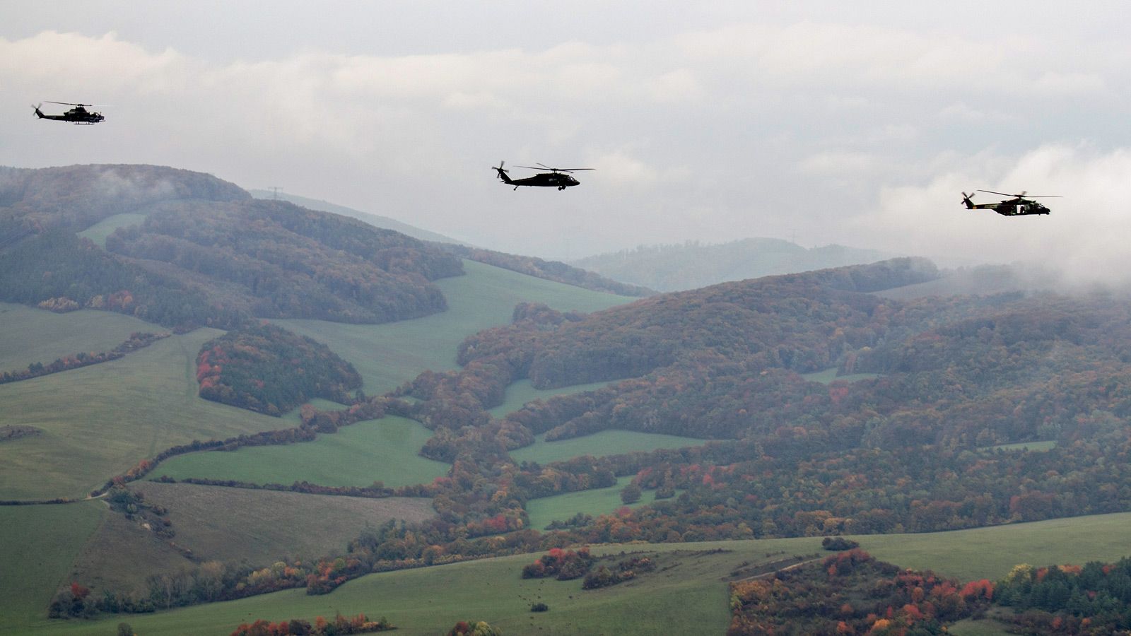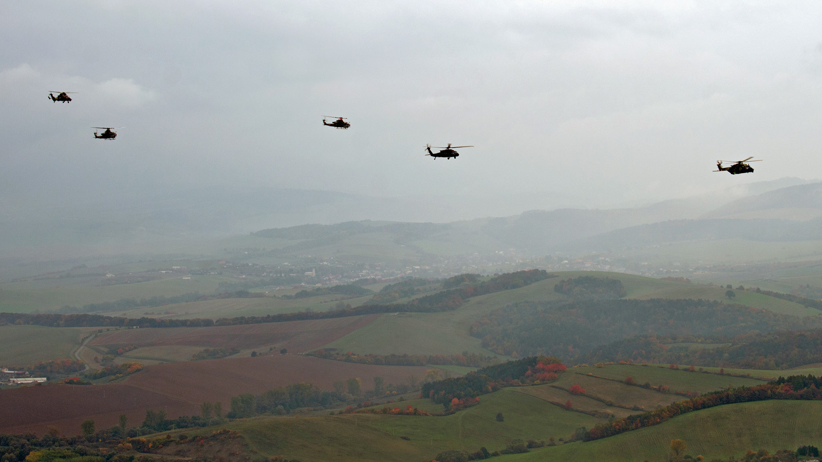 Formace slovenských, španělských a českých vrtulníků při letu nad kopcovitou krajinou v okolí prešovského letiště. V průběhu středeční letové mise panovaly na východě Slovenska typické podzimní povětrnostní podmínky, které od vrtulníkových posádek vyžadovaly absolutní soustředění při létání v kopcovitém a členitém terénu. (foto: 51. krídlo Prešov)