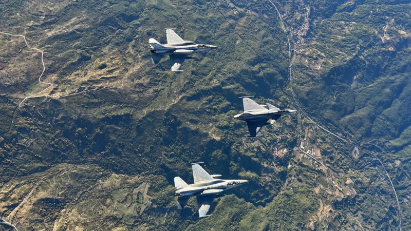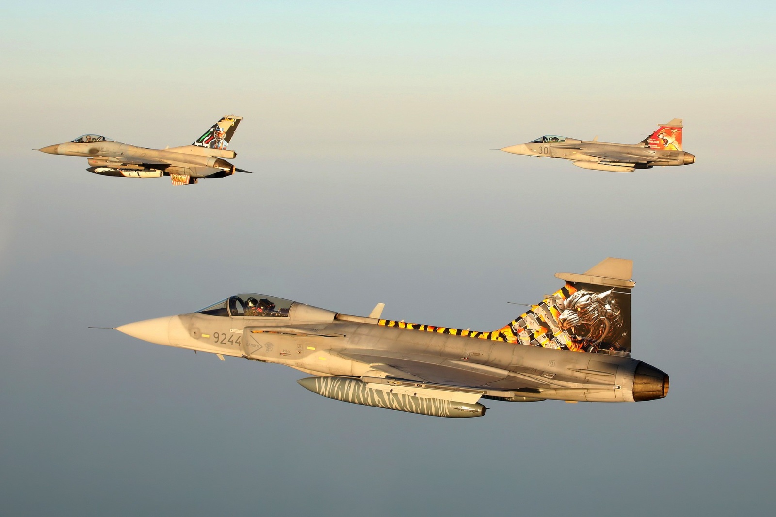 Formace Gripenů 211. tl a řeckých F-16C ze stavu 336. Mira „Olympos“ na základně Araxos zachycená v letu během cvičení „Steadfast Noon 2023“. Řecko sice v roce 2001 vystoupilo z programu „Nuclear Sharing“, ale nadále své stroje používá na konvenční podporu letounů-nosičů v rámci projektu SNOWCAT, kde jsou i naši stíhači na švédských deltách. (Foto 211. tl)