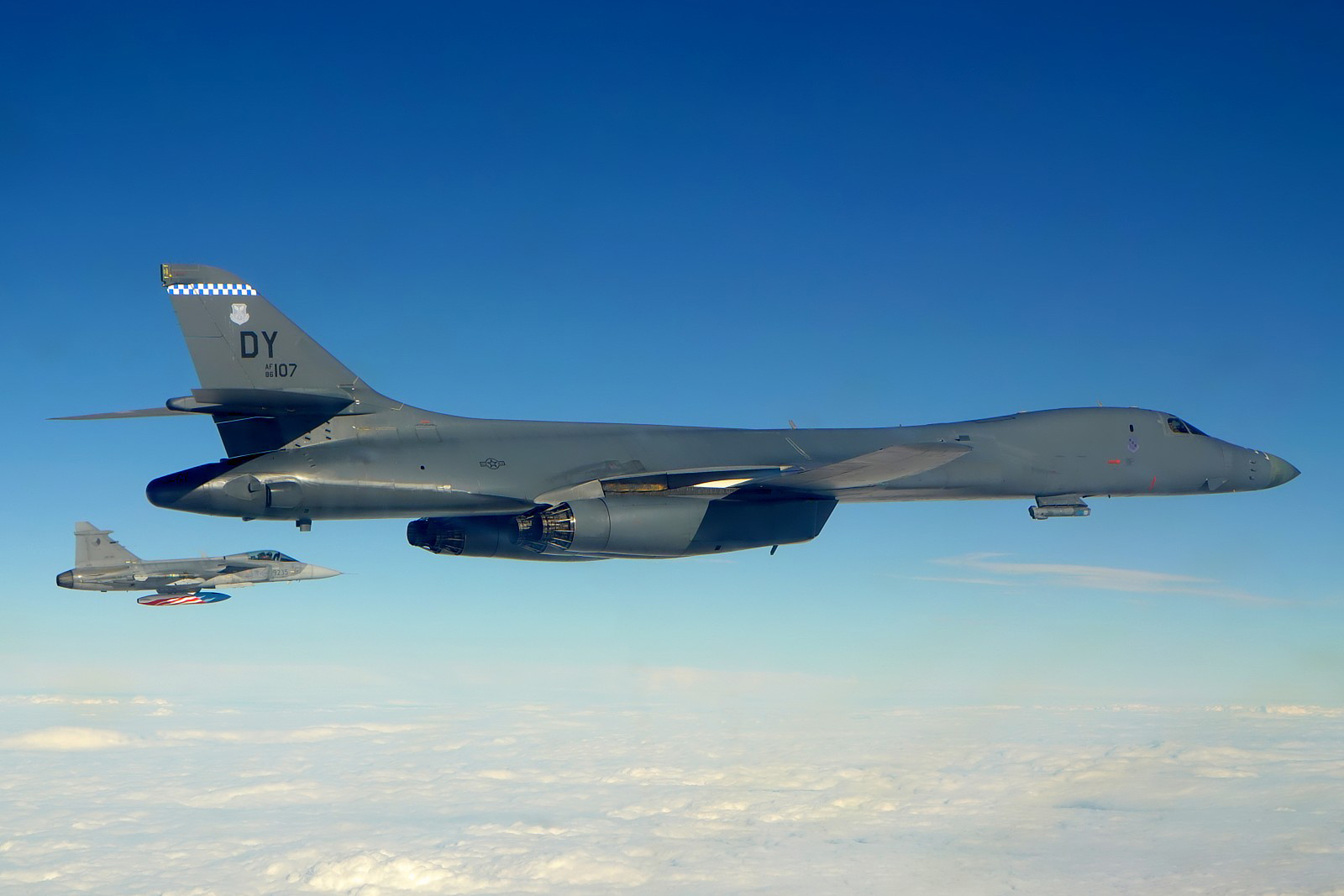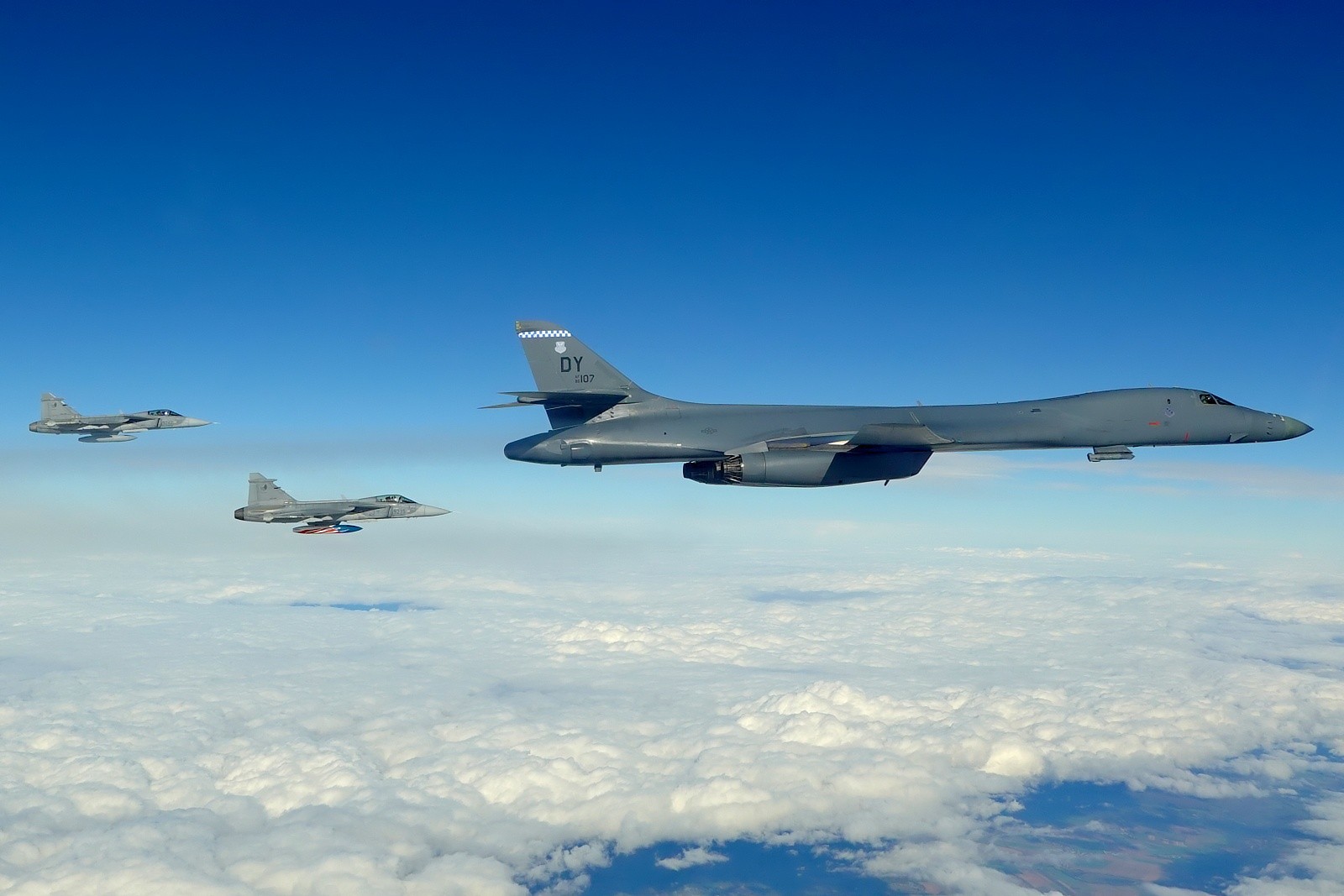 26. října 2023 doprovází hotovostní pár Gripenů tč. 9235 a 9242 s volacími znaky „Charlie Foxtrot 01/02“ ve vzdušném prostoru ČR dvojici B-1B Lancer s volacími znaky „Howler 41/42“ při jejich misi do vzdušného prostoru Rumunska v rámci Bomber Task Force 24-1 ze základny Fairford ve Velké Británii. „Bone“ 86-0107 s podvěšeným zaměřovacím a značkovacím kontejnerem Sniper XR patří podle modro-bílé šachovnice na vrcholu SOP k 28th BS / 7th BW na základně Dyess AFB v Texasu. V Evropě však v té době operoval v rámci 9th EBS. </strong (Foto 9th Expeditionary Bomb Squadron)