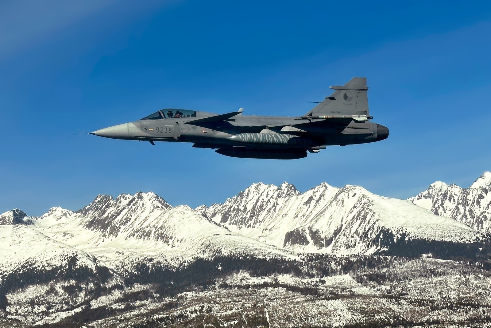 „Naježený“ hotovostní JAS-39C tč. 9238 zachycený nad monumentálními zasněženými vrcholky Vysokých Tater během mise „Tango scramble“ k našim východním sousedům ze Slovenska. Od září 2022 zde naši stíhači působí společně s polskými piloty na F-16C a chrání zdejší vzdušný prostor po ukončení provozu zbylých slovenských Migů-29. Z tohoto důvodu jsou Gripeny v QRA, startující z domácí základny v Čáslavi, podvěšeny dvojicí „baků“ 1 100 l pod křídly a párem standardních IČ naváděných PLŘS krátkého dosahu AIM-9M Sidewinder. (Foto 21. zTL / 211. tl)