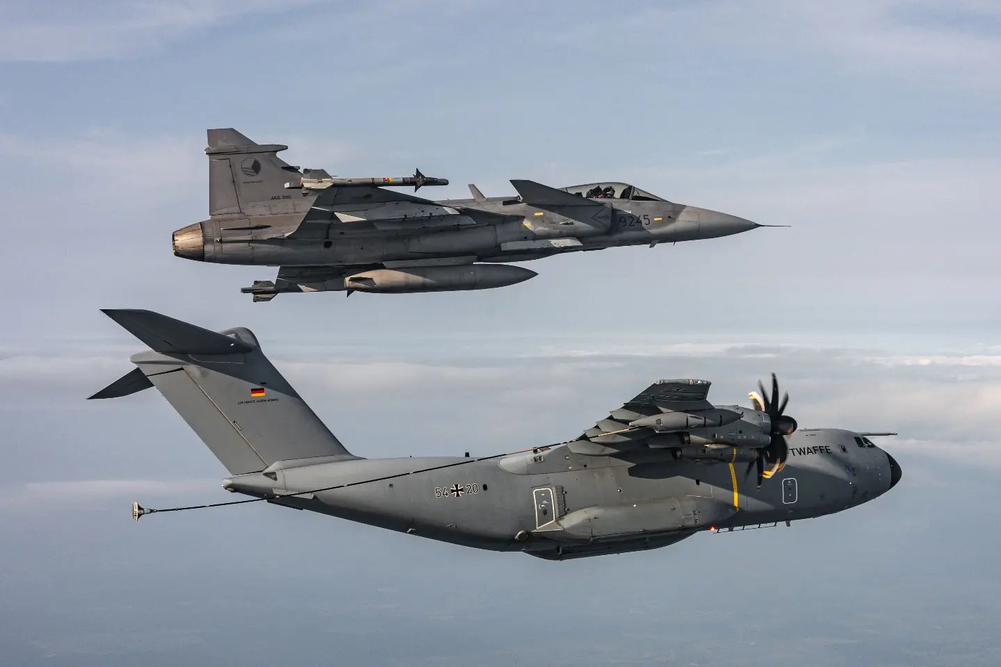 Do misí během aliančního cvičení „Air Defender 2023“ se zapojovaly i české hotovostní JAS-39C. Příkladem je foto „naježeného“ tč. 9245 ve společnosti německého tankovacího A-400M 54+20. Atlas s volacím znakem „Primer 10“ působil na trati mezi Pardubicemi a Šternberkem, kde probíhalo na výšce 16 000 ft doplňování paliva do našich Gripenů. (Foto Ondřej Španko / 211. tl)