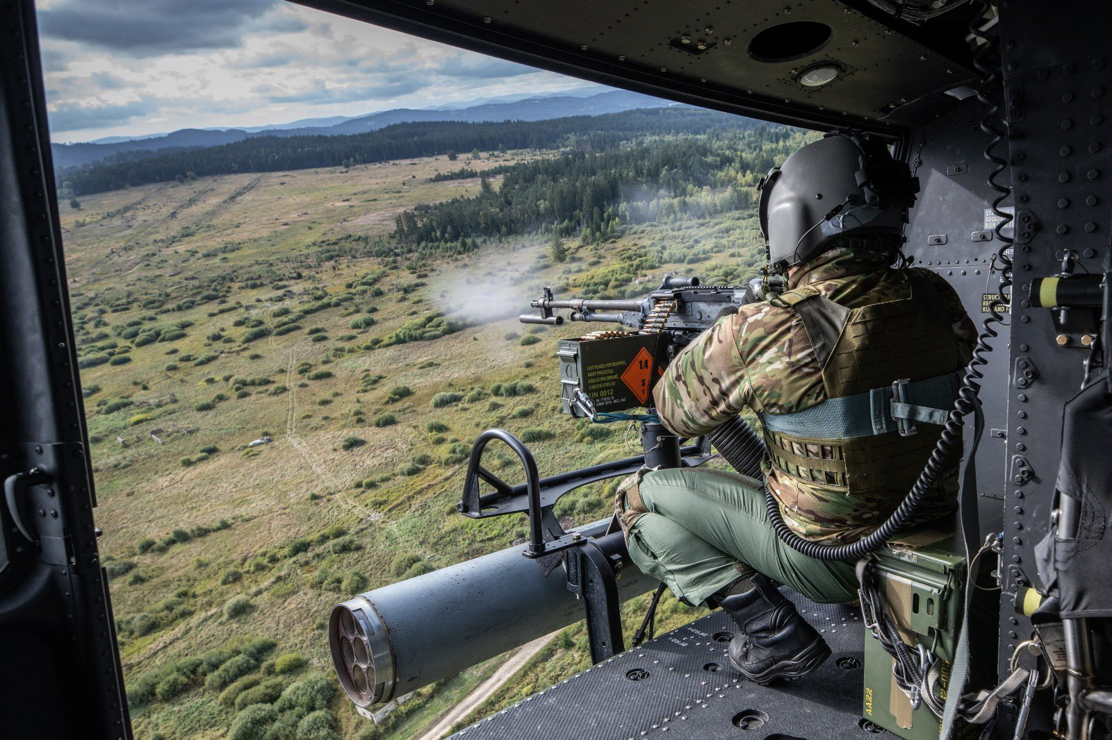 Dvojice víceúčelových Venomů působila v průběhu letových misí z Kunovic s volačkami „GHOST“ a s různou kombinací palubní výzbroje v podobě kulometů M240 ráže 7,62 mm, GAU-16/A ráže 12,7 mm nebo rotačních GAU-17/A ráže 7,62 mm. Zajímavostí je, že oba vrtulníky měly v průběhu cvičení odmontovaná pomocná dvířka nákladové kabiny. Detailní snímky palubních střelců jsou pouze ilustrační a pocházejí z nedávných ostrých střeleb. (foto: LKKU Photography a 22. zVrL)