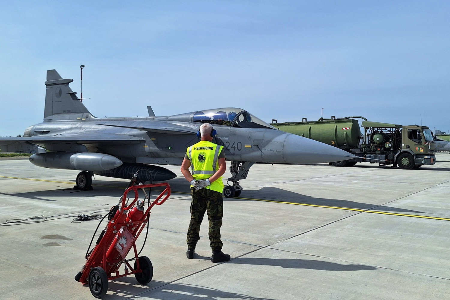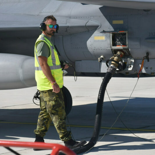 Trojice záběrů z mezipřistání ve francouzském Orange, kde český pozemní personál doplnil Gripenům palivo metodou Hot Refueling se spuštěným motorem. Tato procedura patří mezi poměrně složité úkoly, protože během tankování motor běží, systémy řízení letu jsou aktivní a řídicí plochy se mohou pohybovat. Všichni zúčastnění proto musí přesně znát své úkoly a dokonale spolupracovat, aby byla zajištěna maximální bezpečnost při pohybu okolo letounu. (foto: prap. Milan Polách)