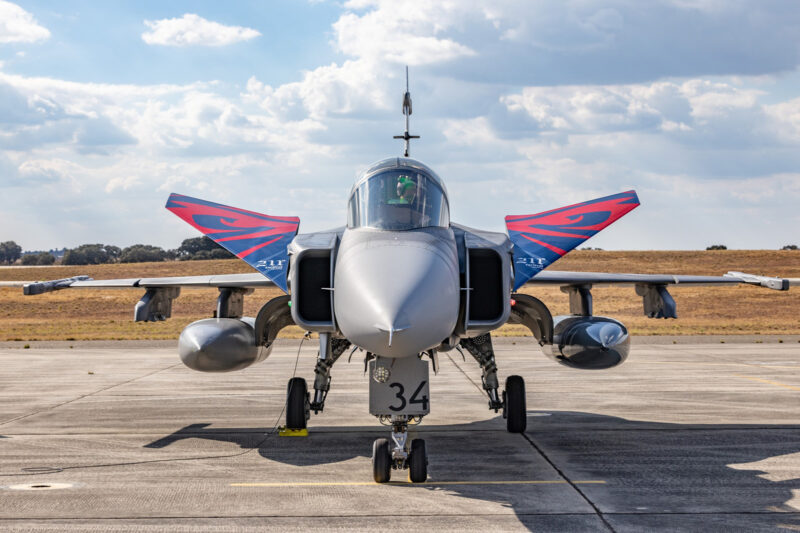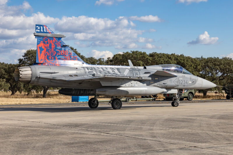České Gripeny během dvou týdnů cvičení NATO Tiger Meet 2025 uskutečnily asi 60 letů v trvání více než 90 hodin a díky skvělé práci pozemního personálu se podařilo odlétat všechny naplánované mise. Přestože letos 211. letka nepředstavila žádnou tygří kamufláž, zaslouženou pozornost budil Gripen ev. č. 9234 s výročním nátěrem k dvaceti letům provozu typu JAS-39 v České republice. (foto: praporčík Tomáš Mládek a Força Aérea Portuguesa)