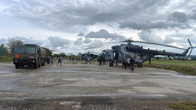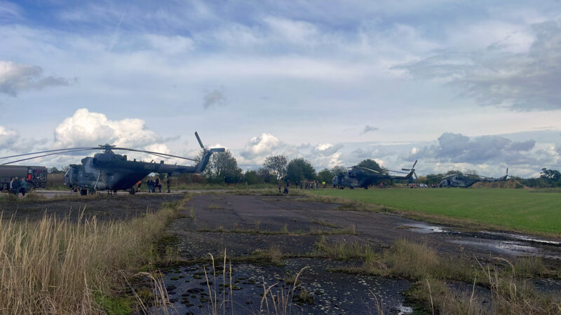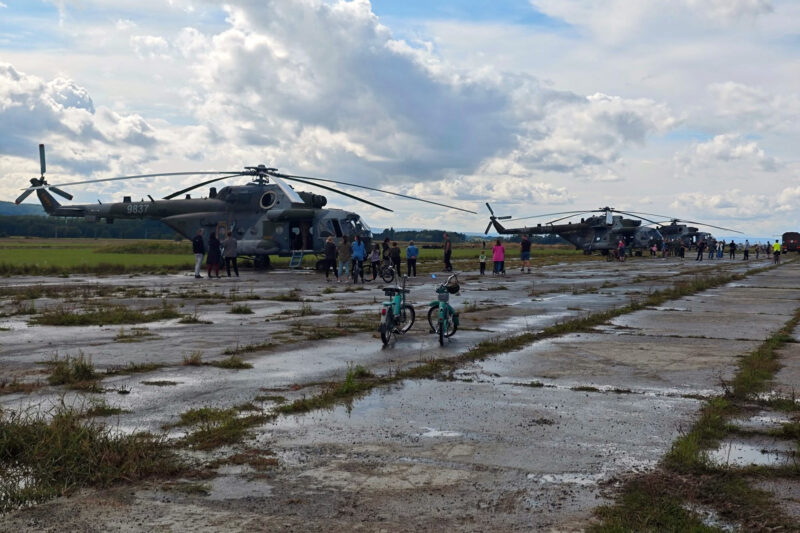 Úplně první náměšťská „stosedmdesátjednička“ zamířila do Polska již ve čtvrtek 11. září, tedy necelých 24 hodin od zveřejnění záměru na vyslání jednotky SOATU do Polska. Tento vrtulník směřoval na základnu Powidz, kde se pravděpodobně řešilo upřesnění operačního úkolu a po dvou dnech se vrátil zpět do Náměšti. V sobotu odlétl do Polska další „Hippo“, který již směřoval na vybrané operační působiště české vrtulníkové jednotky a i on se po rekognoskaci prostoru vrátil ještě týž den zpět do ČR. Samotný přelet formace SOATU byl zahájen v neděli 14. září, kdy trojice „rampových“ Mi-171ŠM po vzletu z Náměšti zamířila na letiště Slezského aeroklubu Zábřeh. Jde o bývalé záložní letiště mošnovského 8. slp pro letouny MiG-21, kde na východní provozní stojánce vrtulníky doplnily palivo z automobilních cisteren CAPL-16M1. Trojice armádních strojů přilákala velké množství „místních“, zároveň je bohužel dobře vidět zcela zpustlá infrastruktura tohoto bývalého záložního letiště. (foto: Jan Kubinec a Slezský aeroklub Zábřeh)