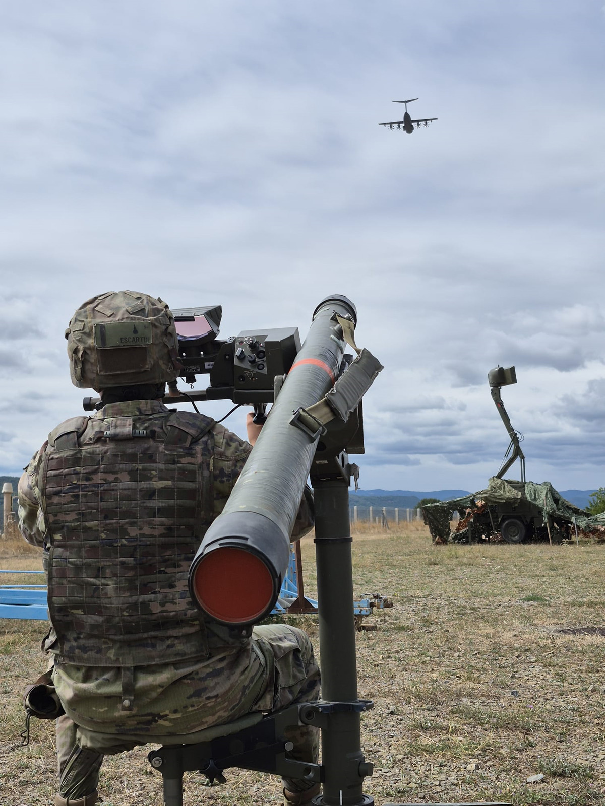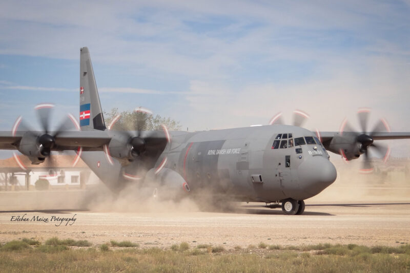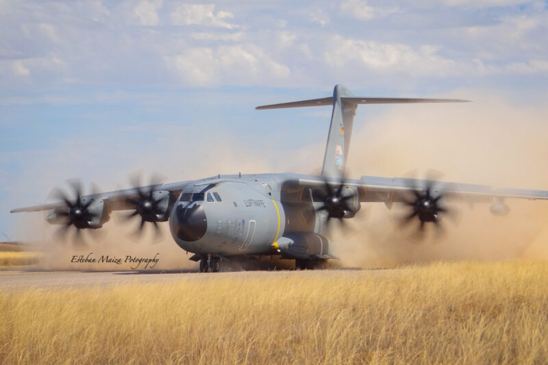 Mezi nejzajímavější scénáře kurzu ETAP-C patří vzlety a přistání na polním vojenském letiště Ablitas, jehož štěrkovo-hliněná dráha generuje při letových operacích obrovské množství prachu. Přistání v těchto náročných podmínkách si pak vyzkoušely všechny posádky zářijového kurzu ETAP-C 25-3, jejichž mise na letiště Ablitas bylo možné sledovat ve čtvrtek 11. září během oficiálního Spotters Day. Vzlety a přistání na této prašné dráze však probíhaly v podstatě od samého zahájení kurzu a již v úterý 9. září sem ze Zaragozy zamířil letoun A400M z 31. křídla španělského letectva, přepravující premiérově polní dělostřelectvo z výsadkové brigády (BRIPAC). Tato operace byla provedena s běžícími motory letadla taktickým manévrem známým jako ERO (Engine Running On/Offload. (foto: Esteban Maiza Photography, https://x.com/EstebanPhoto11 via Defensa.com, https://www.defensa.com)