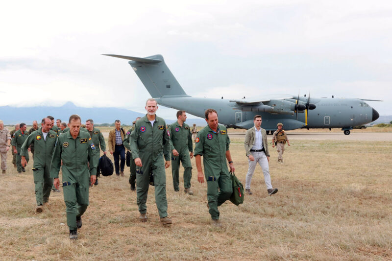Po prohlídce zařízení ETAC zakončil král svůj pobyt na letecké základně připojením se k posádce transportního stroje A400M od 31. křídla, s níž absolvoval jednu výcvikovou misi kurzu. Mise spočívala v taktickém letu nad Pyrenejemi, střelnicí Bardenas a letištěm Ablitas, kde měl král možnost sledovat na vlastní oči taktický let v nízké výšce a postupy, jak se vyhnout hrozbě nepřátelské PVO, jež se v daném scénáři vyskytla. Tato hrozba spočívala v simulovaném použití baterie raket Mistral z výzbroje pluku RACA20, dále UV stimulátorů systému vlastní ochrany BANS (Battlefield Anti-aircraft VShorad System) a s použitím systému SMOKEY SAM, jenž simuluje odpal protiletadlových raket země-vzduch.