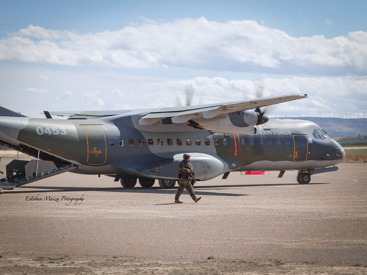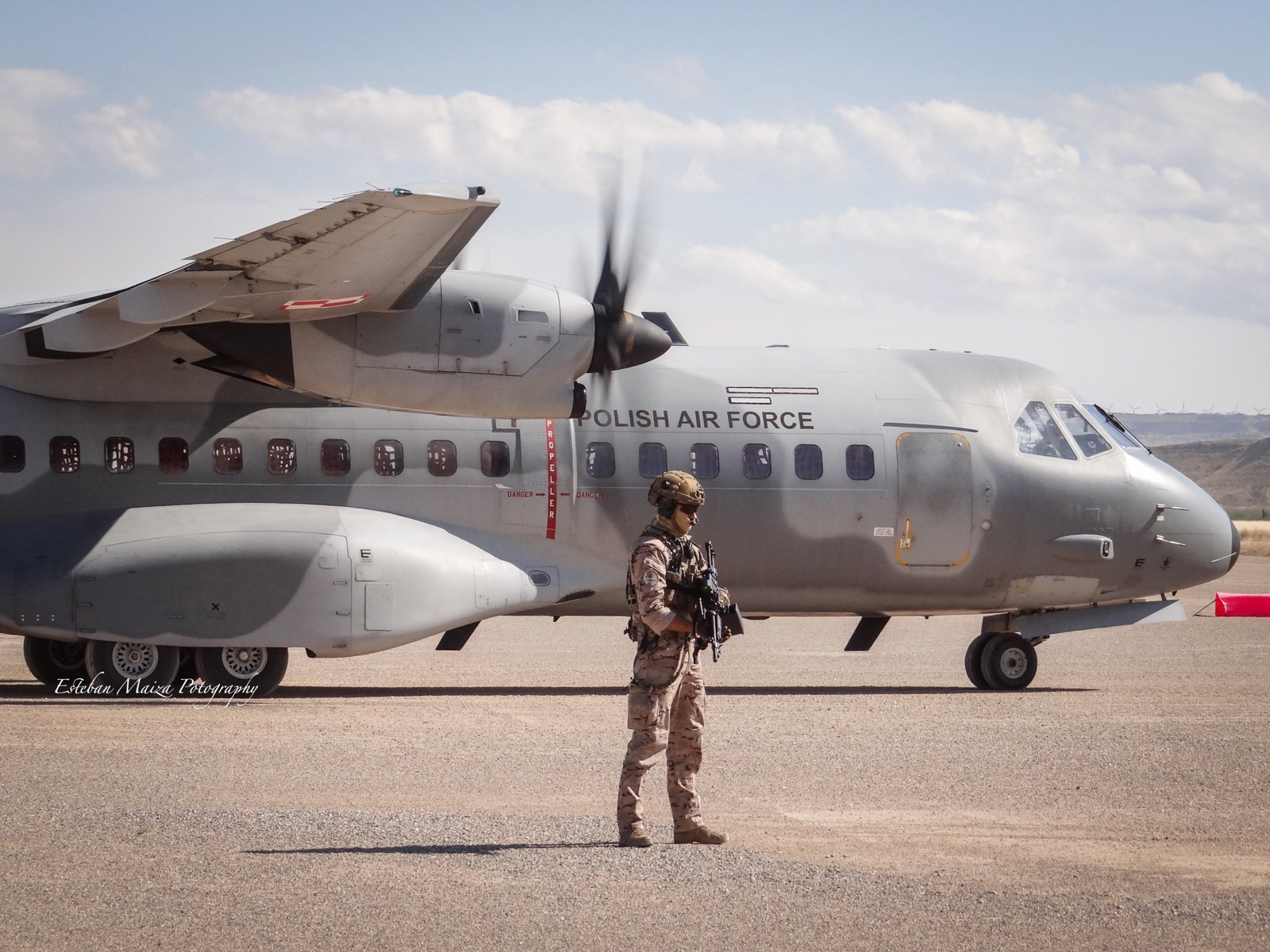 „SMUGGLER 11“ během evakuační mise CASEVAC z polního letiště Ablitas. Ochranu letounu zajišťovali na zemi většinou příslušníci týmu mobilní ochrany AMPT (Air Mobile Protection Team) z Letky podpory vzdušného nasazení EADA španělského letectva, v případě české Casy však tuto činnost zajišťovali přímo vojáci AČR. (foto: Esteban Maiza Photography, https://x.com/EstebanPhoto11 via Defensa.com, https://www.defensa.com)